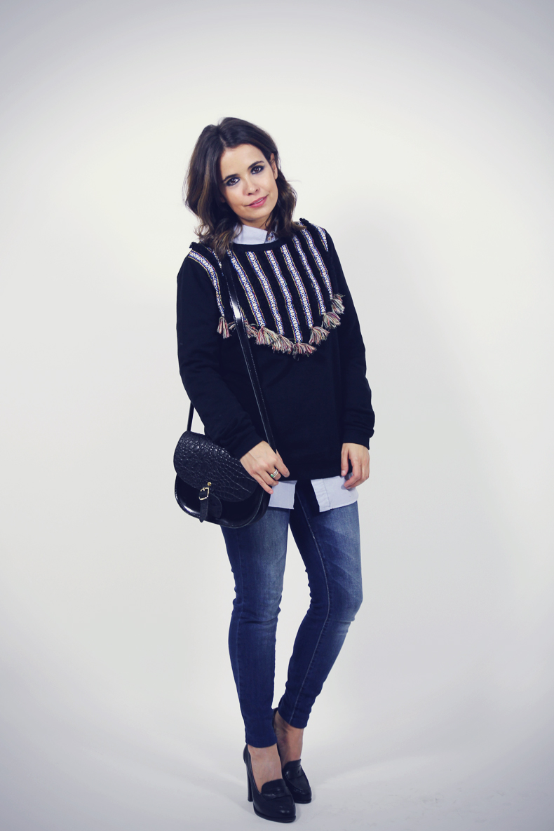 If I told you the last week that I wore rain boots and the day turned sunny, yesterday was the opposite situation. I got up, and without looking at weather pronostic, I decided to wear an outfit nothing suitable for rain, I’m still thinking about the moment I chose wear shoes without socks :S. It’s not necessary tell you how I arrived at home, the fact is that it’s not stopped raining during all day, an we have to take the pics inside our studio. But lets to speak about the outfit, I wear an awesome pompon sweater that Diego gave to me last week, he’s the best boyfriend ever! , I decided to pair it with an oversize shirt and jeans, something simple for a day of work. Hope you like it!